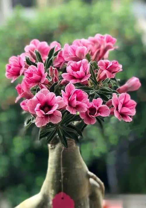沙漠玫瑰的叶片厚实,这种植物的花色鲜艳,真的是很好看的,大家养护沙漠玫瑰,一定要种植在小花盆里,千万不要经常浇水,适当控水,并且定期修剪,等土壤干了再浇水,长势也会更好,在开花之前,追加一些磷钾肥,开花一茬接一茬的。